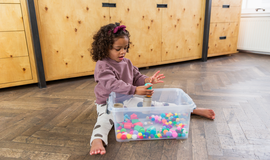 - Fill a sensory bin or small storage container with water, and dump in as many pom poms as you or your child want (consider starting with a few and adding more once your child has had a chance to explore them; too many at once can feel like overload for some children).