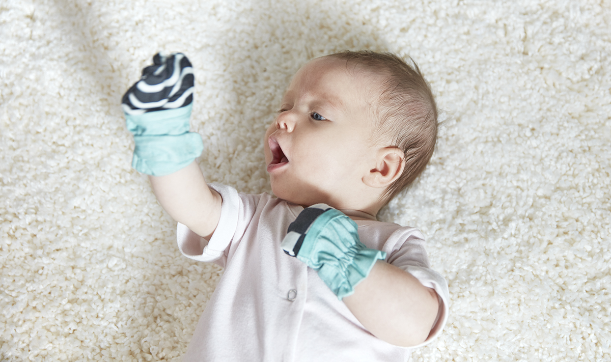 - Place the black-and-white mittens on your baby’s hands while they’re lying on their back, side lying, or during tummy time.